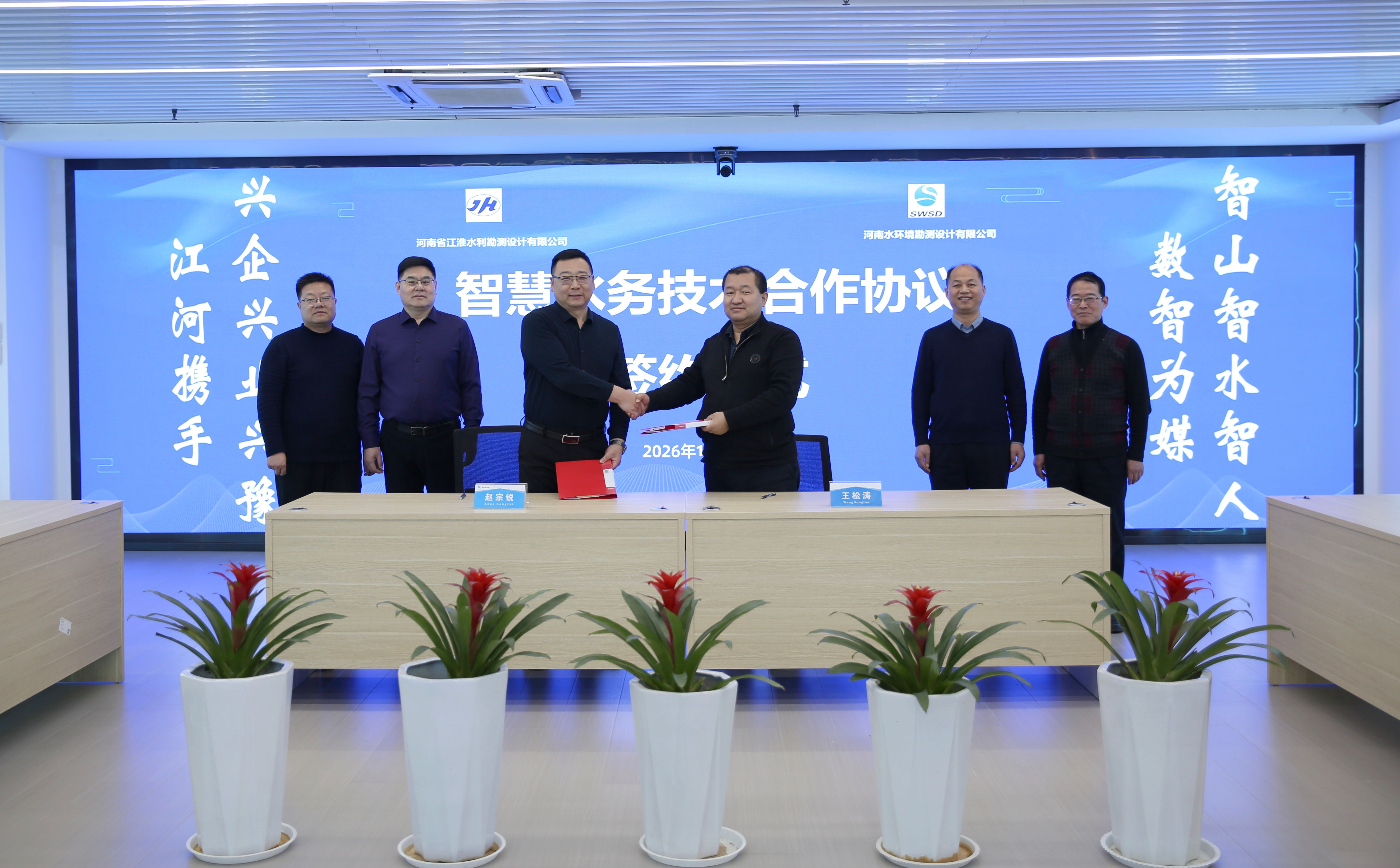2026年1月31日,我公司与河南省江淮水利勘测设计有限公司智慧水务技术合作协议签约仪式在郑州隆重举行,河南省江淮水利勘测设计有限公司董事长张广州、总经理王松涛和我公司董事长张文敏、总经理赵宗锐出席签约仪式,双方相关负责人共同见证这一重要时刻。