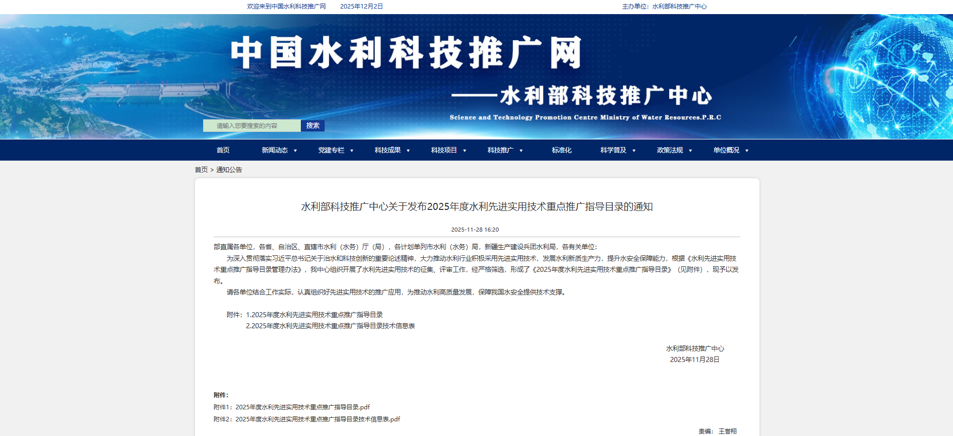 公司智慧灌区信息化建设关键技术 成功入选2025年水利部先进实用技术重点推广目录